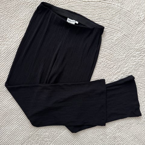 Lahkeet ovat vähän muokatut. Muuten hyvässä kunnossa. Matala vyötärö ja leveät lahkeet.