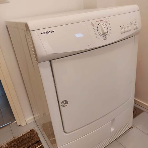 Vanhemmalle ihmiselle aikoinaan hankittu kondensoiva kuivuri Rosenlew Passeli 100. Todellisuudessa hoitoväki ei käyttänyt ollenkaan eli kone uutta vastaavassa kunnossa, vaikka ikää onkin. Malli on tarkoitettu ripustettavaksi seinälle, joten näppärä pienempään kylpyhuoneeseen esim päältä täytettävän pesukoneen kaveriksi. Leveys 59,5cm syvyys 42cm, korkeus 68cm.