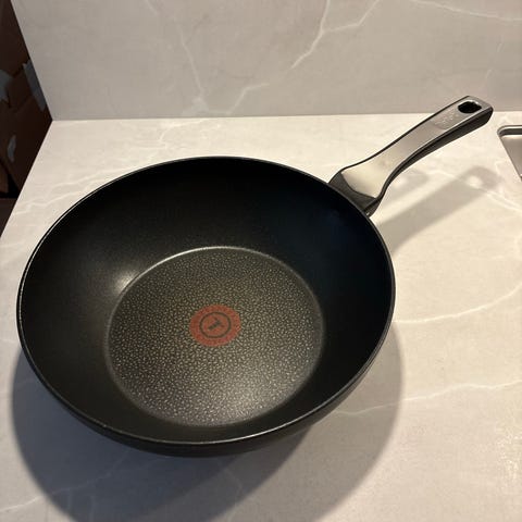 Musta wokkipannu, ei ole varmaan kertaakaan käytetty. Ulkopuolella pohjassa säilyttämisestä tullut hankaus jälkiä, muuten siisti ja ehjä
