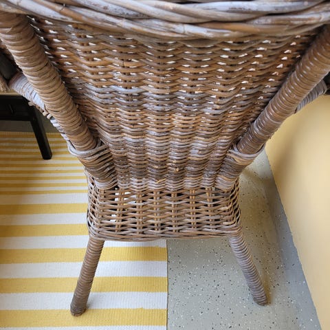 2kpl valkoisia rottinkituoleja mustanharmailla istuintyynyillä. Toinen tuoleista rikki käsinojista.