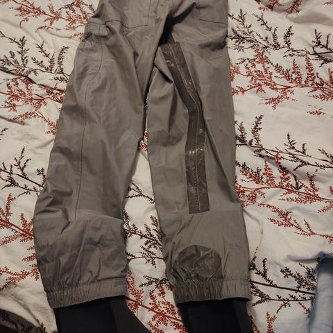 Beigen väriset kalastus- tai kahluuhousut, joissa integroidut mustat neopreenisukat. Housut on tarkoitettu käytettäväksi vedenkestävien kenkien tai kahluukenkien kanssa kalastuksessa tai muussa vesiaktiviteetissa. Lahkeiden alaosassa on kiinteät sukat, jotka auttavat pitämään jalat kuivina vedessä liikuttaessa.