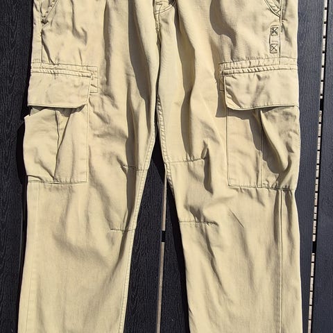 Khakin väriset Jokamies-reisitaskuhousut, kangas polyesteria ja puuvillaa, kevyttä ohutta kangasta, joka sopii arkeen ja ulkoiluun. Paljon taskuja ja muita yksityiskohtia, joustava kuminauhavyötärö ja vyölenkit. Reisitaskuissa tarrakiinnitys. Koko54C, vyötärön ympärys 88 cm ja lahkeen sisäpituus 68 cm.