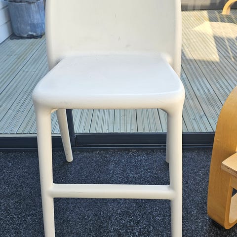 IKEA lasten tuoli pyörillä. Tuolissa on valkoinen selkänoja pyöreillä aukoilla ja harmaa istuinpehmuste. Korkeutta voi säätää kaasujousella, ja viisisakarainen jalusta on varustettu pyörillä liikkumisen helpottamiseksi. Soveltuu lapsen työpöydän tai koulupöydän tuoliksi.