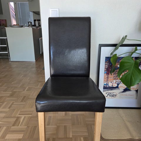 Yhden tuolin selkänoja hieman heiluu ja yhden tuolista puuttuu nappi ja yhden istuimessa pieni tahra.