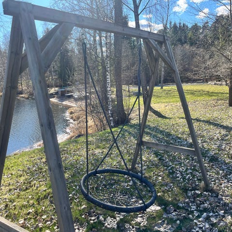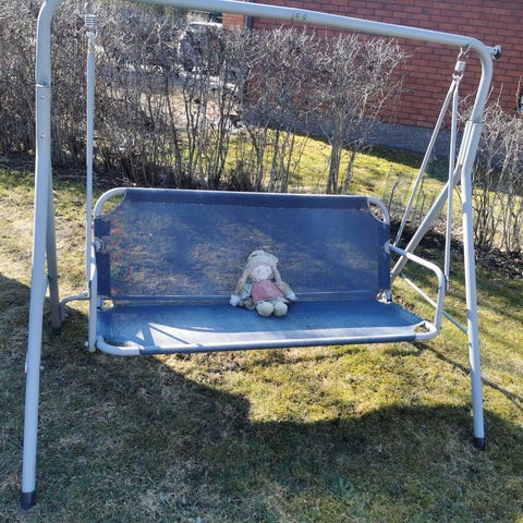 Hyväkuntoinen keinu pehmusteineen. Tukevarunkoinen. N. 2 metriä pituus. Parvekkeen alla ollut suojassa.