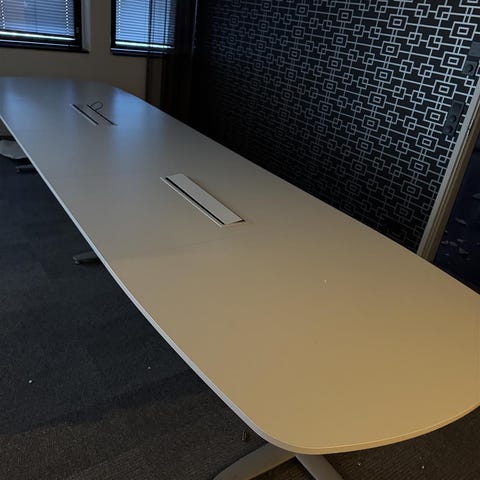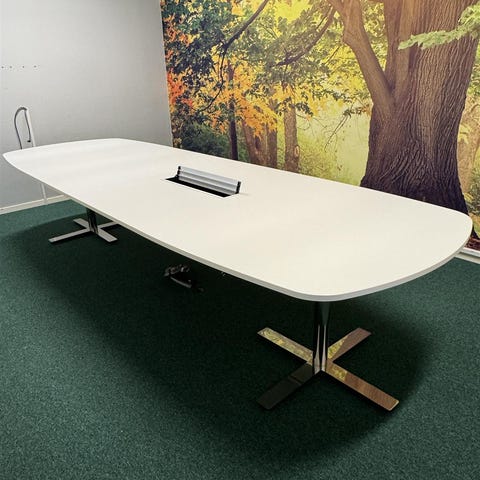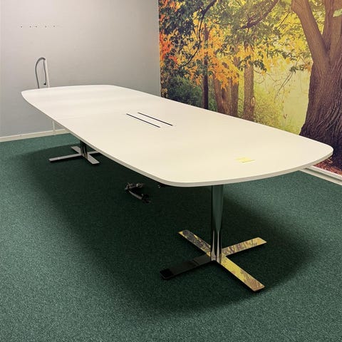Suuri valkoinen Kinnarps Oberon isokokoinen neuvottelupöytä, jossa on integroitu kaapelihallinta keskellä ja pistorasiat. Pöydän jalat ovat metalliset ja tukevat.