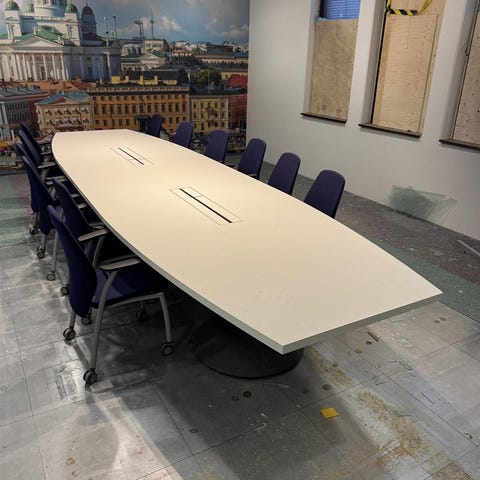 Mukaan saa pöytään 4-8kpl Kinnarps M375 mallin hyväkuntoisia neuvottelutuolia (ks kuva).Pöytä edustaa modernia toimistotyyliä, joka sopii hyvin nykyaikaisiin työympäristöihin. Sen yksinkertainen muotoilu ja käytännöllisyys tekevät siitä erinomaisen valinnan kokoustiloihin.