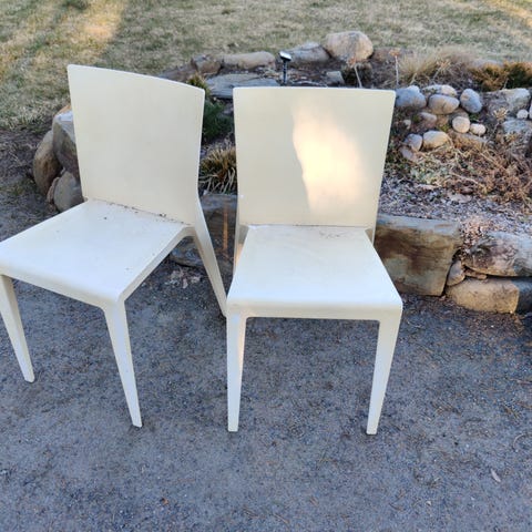Rautaiset valkoiset puutarhatuolit 2 kpl. Voin myydä myös yksitellen. Tuoleissa on pyöreä istuinosa ja koristeelliset, kaarevat selkänojat sekä käsinojat. Soveltuvat ulkokäyttöön esim. puutarhaan, terassille tai parvekkeelle. Materiaali rautaa, jossa on maalipinta, joka paikoin kulunut.