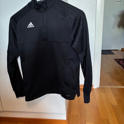 Adidas jalkapallopaita juniorille, koko 152. Pitkähihainen paita, jossa vetoketjullinen kaulus. Väri tummansininen valkoisilla raidoilla olkapäillä ja valkoisilla sivupaneeleilla. Sopii jalkapalloharjoituksiin ja muuhun urheiluun lapsille ja nuorille, joiden vaatekoko on noin 152 cm.