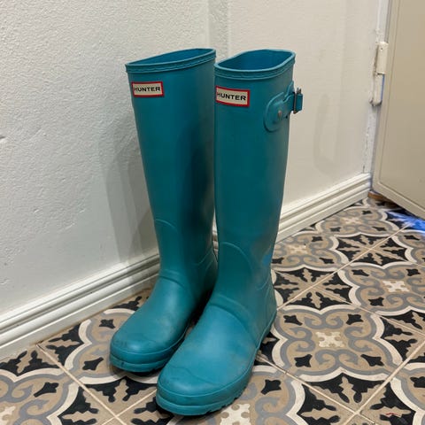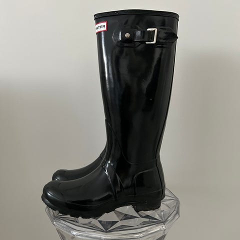 Hunter Sandhurst Carlyle -kumisaappaat, jotka tunnetaan myös nimellä Regent Carlyle. Nämä ovat tyylikkäät, ratsastussaapasvaikutteiset jalkineet, joissa yhdistyvät musta kumivarsi ja viininpunainen tai violetti yläosa.