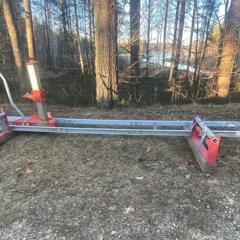 Sahatelineellä ja kiskoilla. Kokonaisuus sisältää moottorisahan, johon on kiinnitetty ohjuri- ja korkeussäätölaite tukin sahaamiseen. Saha liikkuu metallisilla kiskoilla, joiden avulla tukit voidaan sahata laudoiksi tai palkeiksi. Soveltuu puutavaran sahaamiseen esimerkiksi rakennus- ja pihaprojekteissa. Materiaalina metalli telineissä ja tukirakenteissa.