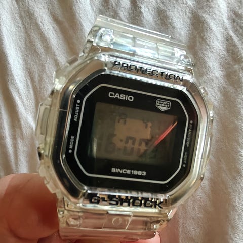 Casio G-Shock unisex-rannekello. Digitaalinen näyttö ja muovinen punainen ranneke. Kello on suunniteltu kestämään iskuja ja kovaa käyttöä. Taustakannessa G-Shock-merkinnät ja Casio-kaiverrus. Sopii käytettäväksi sekä arjessa että urheilussa.