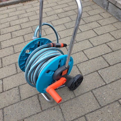 Hozelock letkuvaunu pyörillä. Siirrettävä letkukela, jossa on käsikampi letkun kelaukseen ja vetoaisa kuljettamista varten. Kela on harmaa ja keltaisin yksityiskohdin, ja se on tarkoitettu puutarhaletkun säilytykseen ja käyttöön pihalla tai puutarhassa. Runko on metallinen ja kelassa on kaksi pyörää helpottamassa siirtelyä.