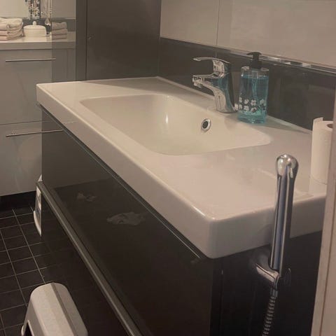 Annetaan Ikean allaskaappi ja allas. Altaan lasitteessa vaurioita, mutta ei halki.