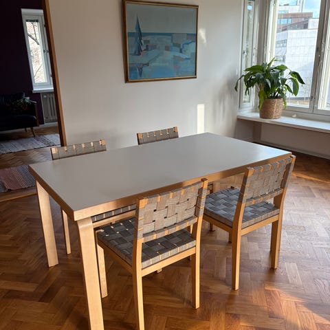 Valkoinen pöytälevy, jalat koivua. Soveltuu esimerkiksi ruokapöydäksi tai työpöydäksi. Kannen pinnassa ja reunoissa on vähäisiä käytön jälkiä, jotka näkyvät kuvissa.