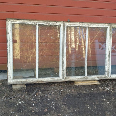Vanhoja ikkunoita 1800-luvun loppupuolen rakennuksesta. Ikkunat kaikki ehjiä, pokat myös mutta maalipinta heikko. Isommat ikkunat, kolmeruutuiset (4 kpl 57x130, 4 kpl 47x130 ja 1 kpl 31x130) 10 €/kpl ja pienet kaksiruutuiset (2 kpl 47x79 ja 1 kpl 32x85) 5 €/kpl. Kaikki yhteensä 100€