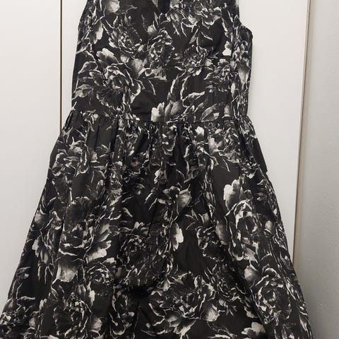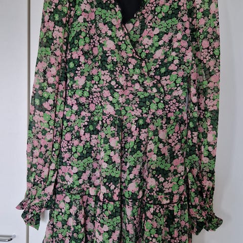 Mustapohjainen pitkä kukkamekko. Musta vuori ja päällä läpikuultava kukkakangas. Hihat ovat ilman mustaa vuorta, mikä keventää ilmettä kivasti. Kangas on mukavan joustavaa, mikä tekee mekosta helposti puettavan, vaikkei siinä ole vetoketjua. Edessä pientä laskostusta. Koko 38/40.