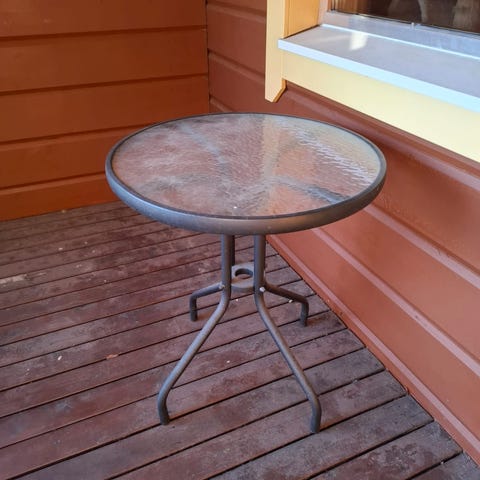 Korkeus 75cm, halkaisija n.60x60cm. Pinnassa pari jälkeä, muuten siisti. Tukeva pöytä kivialustalla Hp.65 € ( ovh 169€) ,Palokka