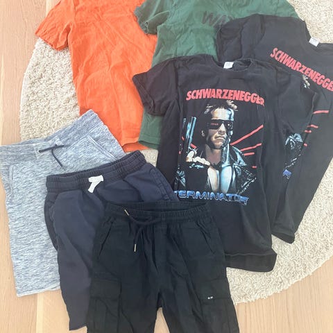 Siniset shortsit name it kokoa 152 mutta menee myös 158 kokoiselle koska ovat joustavat. Housen paita kokoa 164 menee toki myös 158 kokoiselle. Farkut ja kahdet muut shortsit H&M kokoa 158