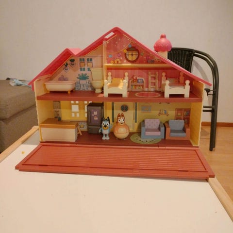 Bluey leikkitalo. Kaksikerroksinen talo, jossa on useita huoneita, kuten keittiö, olohuone, makuuhuone ja kylpyhuone. Talon mukana tulee irrotettavia kalusteita, kuten sänkyjä, kylpyamme ja wc sekä pieni Bluey-hahmo. Talo on muovia ja sen voi avata leikkiä varten sekä sulkea kuljetusta ja säilytystä varten. Soveltuu lasten rooli- ja mielikuvitusleikkeihin sisätiloissa. Nouto tai postitus ok!