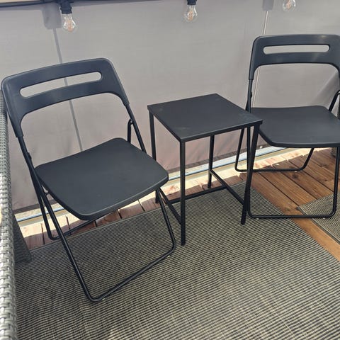 Valkoinen 3 tuolia ja lasipintainen matala pöytä settinä. Kahdesta tuolista vaijeri irronnut, voinee korjata kyllä.
