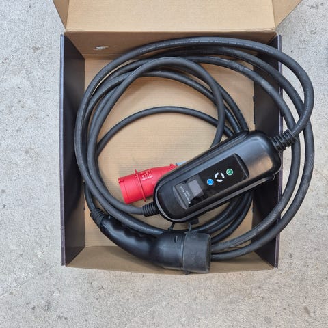 Sähköauton latauskaapeli 11kW punaiseen voimavirtaan tai mukana tulevalla adapterilla tavalliseen suko-pistorasiaan. 16 ampeeria, type2. Virta säädettävissä pienemmäksi. Ajastusmahdollisuus. 5m kaapeli. Suko-adapterilla n. 5,5m.