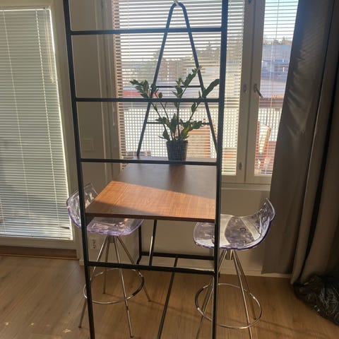 Baaripöytä ja tuolit. Tuolit ikean ja pöydän merkistä ei tietoa. Ollut ulkosäilytyksessä, mutta kunto hyvä ja muuten ihan siisti. Pöytälevyssä joitakin naarmuja. Pöydän halkaisija 74,5cm.