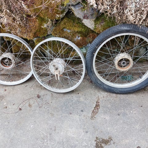 käyttöpeliin,, 17", jarru ei ota kiini mutta vipu liikuu,, akseli pitää vaihtaa, pyörii mallikaasti, lievä heitto kehässä,