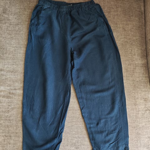 100 % pellavaa. Paperbag-mallinen vyötärö. Kunto hyvä, väri tasainen musta (kuvassa valo vähän vääristää). Säilytyksestä ryppyiset.