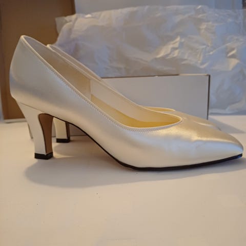 Luonnonvalkoiset / vaaleat hääkengät koko 39. Nämä ei purista eikä paina mistään, ihan supermukavat jalassa! Itse tilailin kriiseissäni useammat hääkengät ja päädyin lopulta eräisiin toisen mallisiin, mutta nää on aivan ihanat jalassa ja voin vaan suositella!