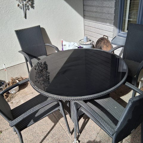 Parveke, piha tai keittiö kalusteet. Musta valkoiset. Siistit. Lasi pöytä ja 2 metalli/ muovi tuolia. Kaukajärvellä. Kuljetus mahdollisuus kohtuullisella maksulla.