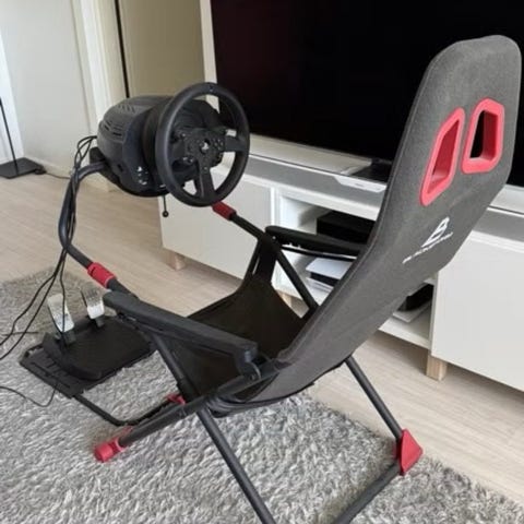 Playseat ajosimulaattori-istuin, jossa integroitu metallinen runko rattitelineellä ja poljinlevyllä. Istuimessa vaalea/beige verhoilu ja selkäosassa Playseat-logo. Rattiteline on korkeussäädettävä ja kiinnitetty tukevasti runkoon. Pakettiin kuuluu erillinen poljinsetti, joka kiinnittyy omaan alustaan. Soveltuu ajopelien pelaamiseen yhteensopivan ratin ja polkimien kanssa kotikäytössä.
