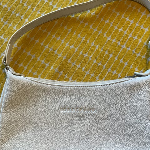 Longchamp nahkalaukku naisille. Laukku on valmistettu valkoisesta grain nahasta ja siinä on kaksiosaiset kantokahvat olalla tai kädessä kantamiseen. Laukussa on vetoketjusuljenta ja läppä, jossa metallinen nappikiinnitys sekä Longchamp-logo. Sisäpuoli on vuorattu kankaalla ja sisältää taskuja pientavaroille. Mittoja: laukun pohja on 13x30cm, leveämpi ylhäältä, 40cm ja korkeus 24cm. Kantokahvojen kanssa noin 45cm
