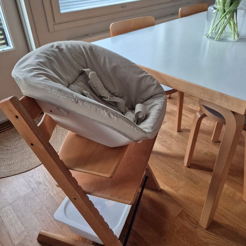 Keltainen babysetti Tripp Trapp syöttötuoliin. Selkänoja ja etuosa.