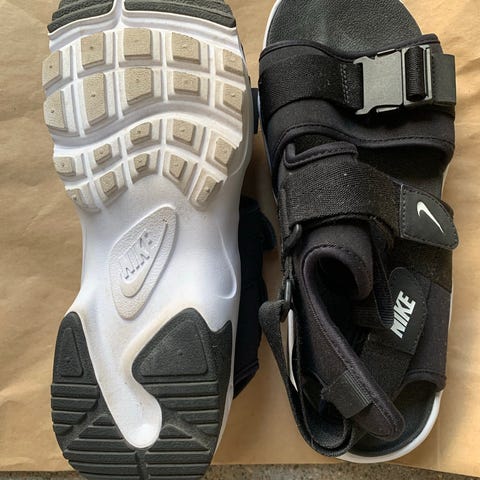 Nike sandaalit, koko 42,5 Väri sininen. Avoinkärkinen malli, jossa yhtenäinen yläosa ja Nike-logo sivussa. Pohjassa kuviointi paremman pidon takaamiseksi. Sopivat arki- ja vapaa-ajan käyttöön, esimerkiksi sisä- tai ulkokäyttöön kuivissa olosuhteissa.