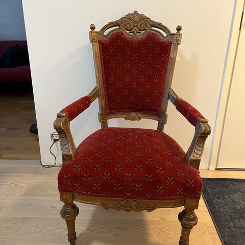 Puurunkoinen tuoli/nojatuoli, verhoilu puna-beige raita, paksu irrotettava istuintyyny, hyvä kunto, ei tahroja, irtotyyny sisältyy hintaan, uusvanha, antiikkimuotoiltu.