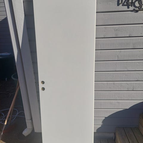Mdf-väliovi karmeineen. Karmit 90x200. Ollut pesuhuoneen ovena, jonka seurauksena kosteus on aiheuttanut hieman pintavaurioita.