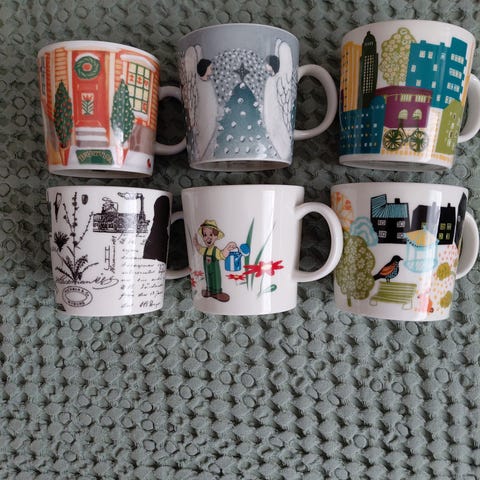 Iittala mukit, kuviollinen monivärinen koristelu. Materiaalina posliini. Mukeissa on korva ja ne soveltuvat juomien, kuten kahvin, teen tai kaakaon tarjoiluun. Pohjamerkinnän mukaan mukit kestävät astianpesukoneen, mikroaaltouunin, pakastuksen ja uunista pöytään -käytön. Sopivat arki- ja kattauksiin keittiössä. Osassa mukeissa sisäpinnalla pientä kulumaa. Myydään mieluiten settinä, 6 kpl. Vain nouto Alppilan alueelta.