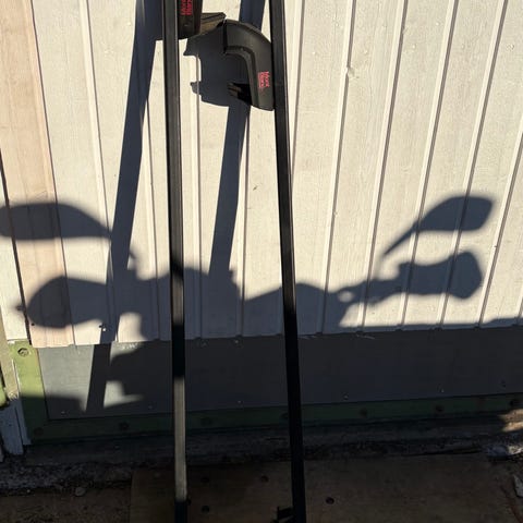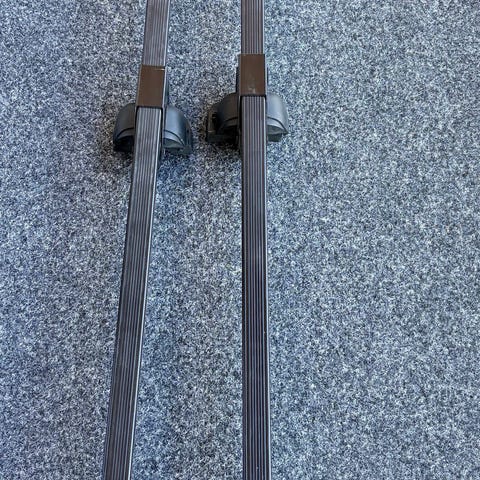 Mont Blanc kattotelineet. Mustat poikkiputket, joissa metalliset kiinnityspannat ja muoviset kiinnikkeet. Sopivat auton kattokaiteisiin tai kiinnityspisteisiin mallikohtaisesta sovitteesta riippuen. Olleet käytössä Skoda Octaviassa. Kulumaa ja ruostetta näkyvissä kiinnikeosissa kuvien mukaisesti.