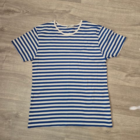 Marimekko T-paita, koko M. Materiaalina puuvilla. Värinä sinisen sävyiset vaakaraidat. Pyöreä pääntie ja lyhyet hihat. Ei vastaa uutta mutta on täysin käyttökelpoinen.