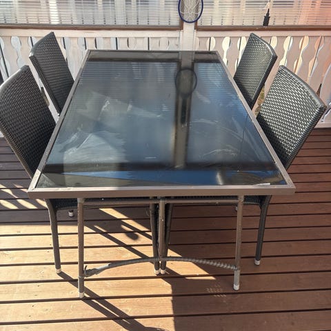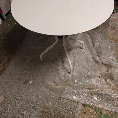 Pöytä hieman parempi pinnaltaan kuin tuolit, hieman haalistunut. Siihen kun laittaa vahapöytäliinan päälle, niin menee vaikka hienommissakin pidoissa. Erittäin tukeva pöytä muovipöydäksi.
