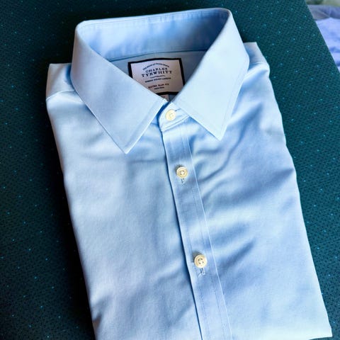 Istuvuus Tyrwhitin 'Extra slim fit, eli muihin valmistajiin verrattuna pikemminkin tyypillinen slim fit-istuvuus (Tyrwhitin leikkauksissa regular=teltta, slim fit ="tavallinen leikkaus" ja extra slim fit = kapeampi istuvuus) ompelija avannut selkäpuolen muotolaskokset, joten istuvuus todellakin vastaa tyypillistä slim fittiä. Helppohoitoinen non-iron. Paidat ovat käytettyjä, mutta yleisilme on siisti.