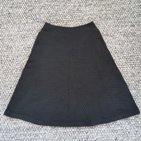 Marimekko Samu-Jussi Koski suunnittelema hame. Koko 38. Väri musta, jossa vaaleanpunaisia ja valkoisia kukkakuvioita. Materiaali 100 % puuvillaa. Hameessa levenevä malli ja laskoksia helmassa.