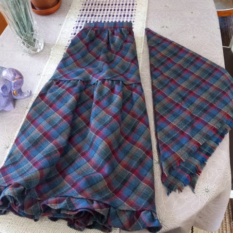 * upea laadukas vanha kudottu villakangas, essuksi ? Hp 40 €, näistä saa edullisen, kauniin laadukkaan edullisen ns. oman kansanperinneasun. Joku valkoinen puserokin löytyy - huivi -