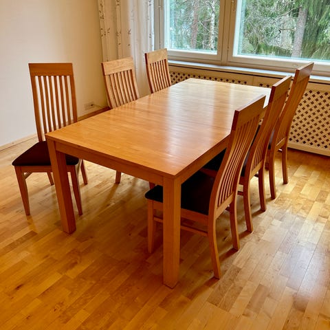 Myydään iso ja tukeva massiivipuinen ruokapöytä sekä 5 tuolia.