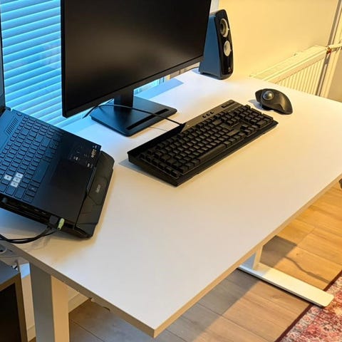 Valkoinen ikean säädettävä työpöytä. Syvyys: 70 cm, leveys: 120 cm, korkeus: 72-122 cm. Hyväkuntoinen.