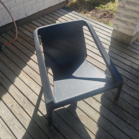 Kaksi harmaata puutarhatuolia nyt edullisesti 40 euroa kappale. Materiaali polyrottinkia ja metallia.