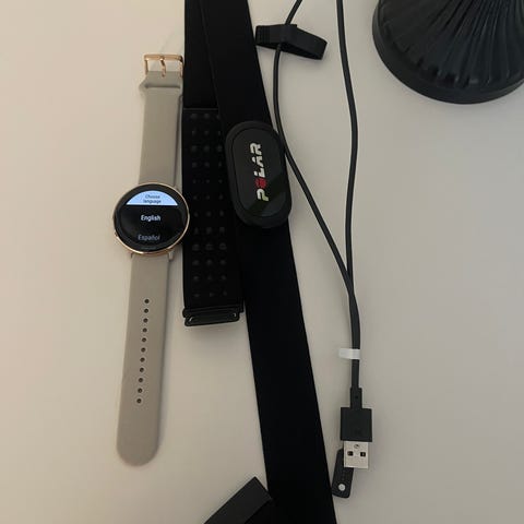 Polar sykemittarikello ja yhteensopiva sykevyö. Kellossa musta ranneke, jossa useita säätöreikiä ranteen koon mukaan. Sykevyössä säädettävä hihna ja Polar-lähetinosa. Sopii sykkeen seurantaan esimerkiksi juoksussa, kävelyssä ja muussa kuntoilussa, kun halutaan mitata sykettä ranteesta ja rintakehältä. Tuotteet ovat moitteettomassa kunnossa.