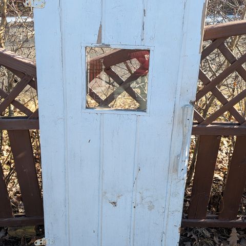 Myydään pieni ovi esim varastoon, leikkimökkiin. Karmin mitta 82.5x177 ja ovi 74.5x170 cm. Tarvittaessa sinistä panelia lukon reiän paikkaukseen