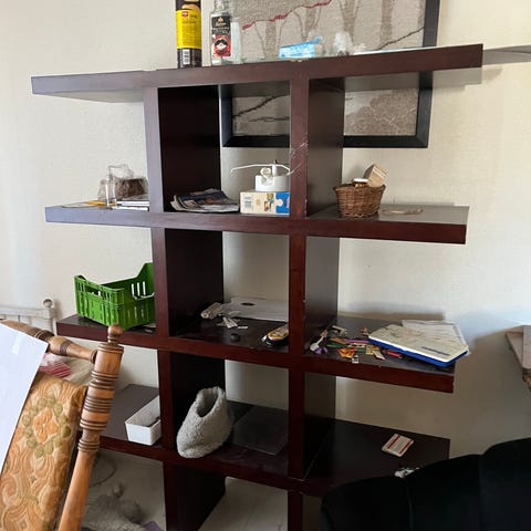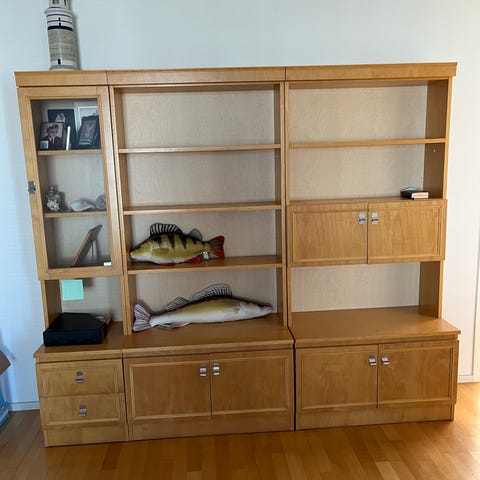 Laadukas kirjahylly/ tv-taso umpipuuta. Koostuu neljästä moduulista, jotka voi sijoittaa mieluiseen järjestykseen yhteen tai erilleen. Palat: korkea hylly, laatikosto, lasivitriini ja pieni matala hylly. Annetaan kaikki yhdessä. Erinomainen kunto. Vain pieniä käytön jälkiä.
